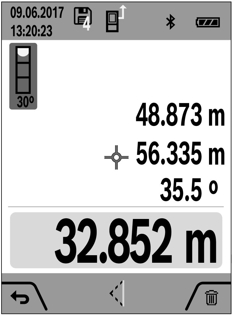 Angka nilai memori ditampilkan pada display bagian atas dan simbol fungsi pengukuran terkait ditampilkan di sebelah kiri. Jika tidak ada nilai yang tersedia di memori, pada display bagian bawah akan ditampilkan "0.000“ dan "0“ di bagian atas.