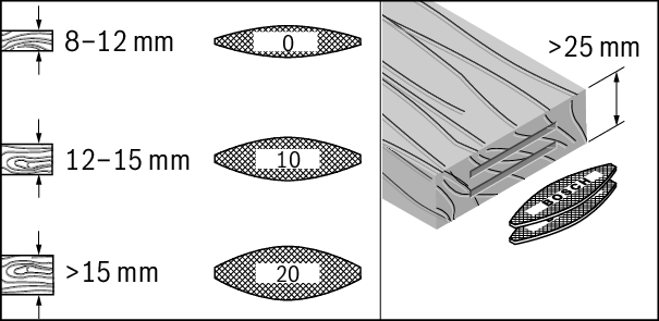 - Mitre/bevel joints: with angle guide see figure E, with height-adjustable stop see figure F