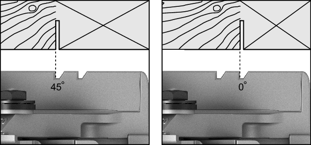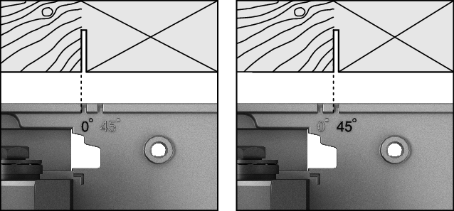 The 0° cut mark (9) indicates the position of the saw blade when making a right-angled cut. The 45° cut mark (8) indicates the position of the saw blade when making a 45° cut.