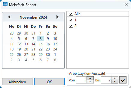 Wählen Sie im Kalender das Datum, für das Sie den Report erstellen möchen. Das ausgewählte Datum wird blau hinterlegt. Markieren Sie dann die Nummern aller Arbeitszyklen, für die Sie den Report erstellen möchten. Bestätigen Sie die Auswahl mit <OK>, um den Mehrfach-Report zu speichern.