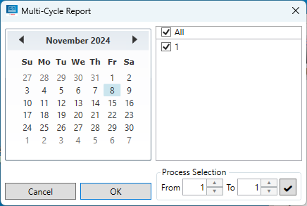 Nel calendario selezionare la data per cui si desidera creare il report. La data selezionata è evidenziata in blu. Contrassegnare poi i numeri di tutti i cicli di lavoro per cui si desidera creare il report. Confermare la selezione con <OK> per salvare il report multiplo.