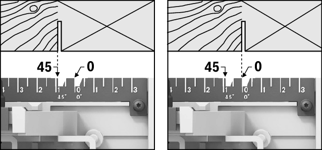 The 0° cut mark (12) indicates the position of the saw blade when making a right-angled cut. The 45° cut mark (11) indicates the position of the saw blade when making a 45° cut.