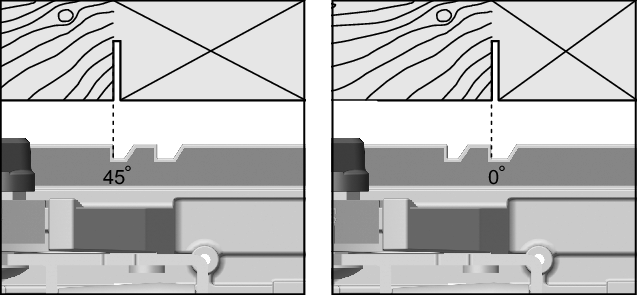 The 0° cut mark (12) indicates the position of the saw blade when making a right-angled cut. The 45° cut mark (11) indicates the position of the saw blade when making a 45° cut.