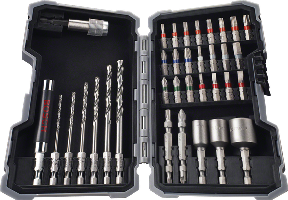 | 2 607 017 328 | PH1; PH2; PH3; PZ1; PZ2; PZ3; SL3; SL4; SL5; SL6; HEX3; HEX4; HEX5; HEX6; TH10; TH15; TH20; TH25; TH27; TH30; TH40 | 25; 25; 25; 25; 25; 50; 70; 74; 83; 88; 99; 105; 60; 60 | Set Content: PH1, PH2, PH3, PZ1, PZ2, PZ3, S 3/4/5/6, H3, H4, H5, H6, T10, T15, T20 (2x), T25, T27, T30, T40, Nutsetter 8/10/13 mm, HSS-G 2.5/3.0/3.5/4.0/5.0/6.0 mm, Double blade PH2/PZ2, Double blade Th20/Th25 | 35 Pcs | 166.00 MYR | Find a local dealer |